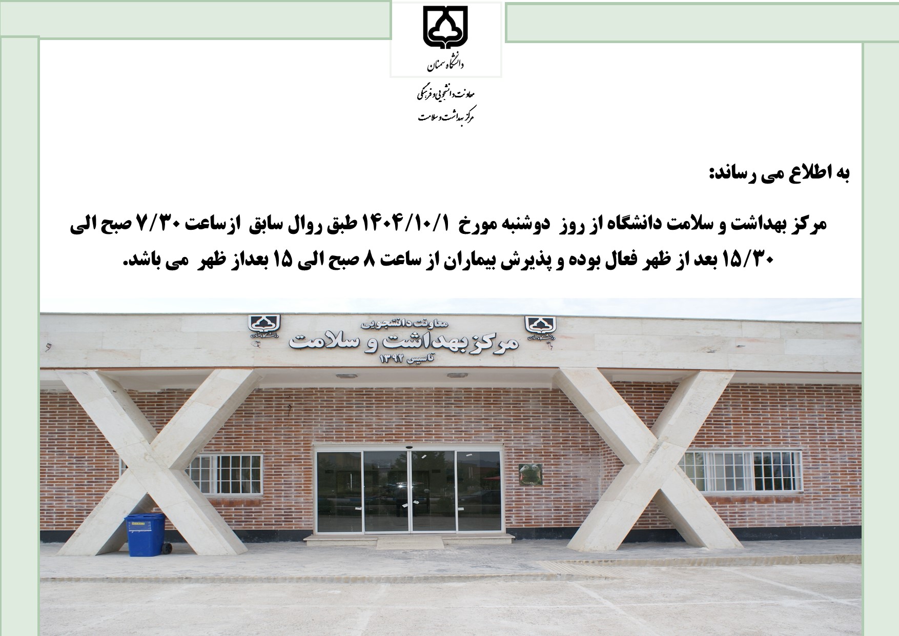 اعلام بازگشت ساعت کاری مرکز بهداشت و سلامت دانشگاه طبق روال سابق 1404/10/07 - 10:59 تعداد بازدید: 25 کلمات کلیدی